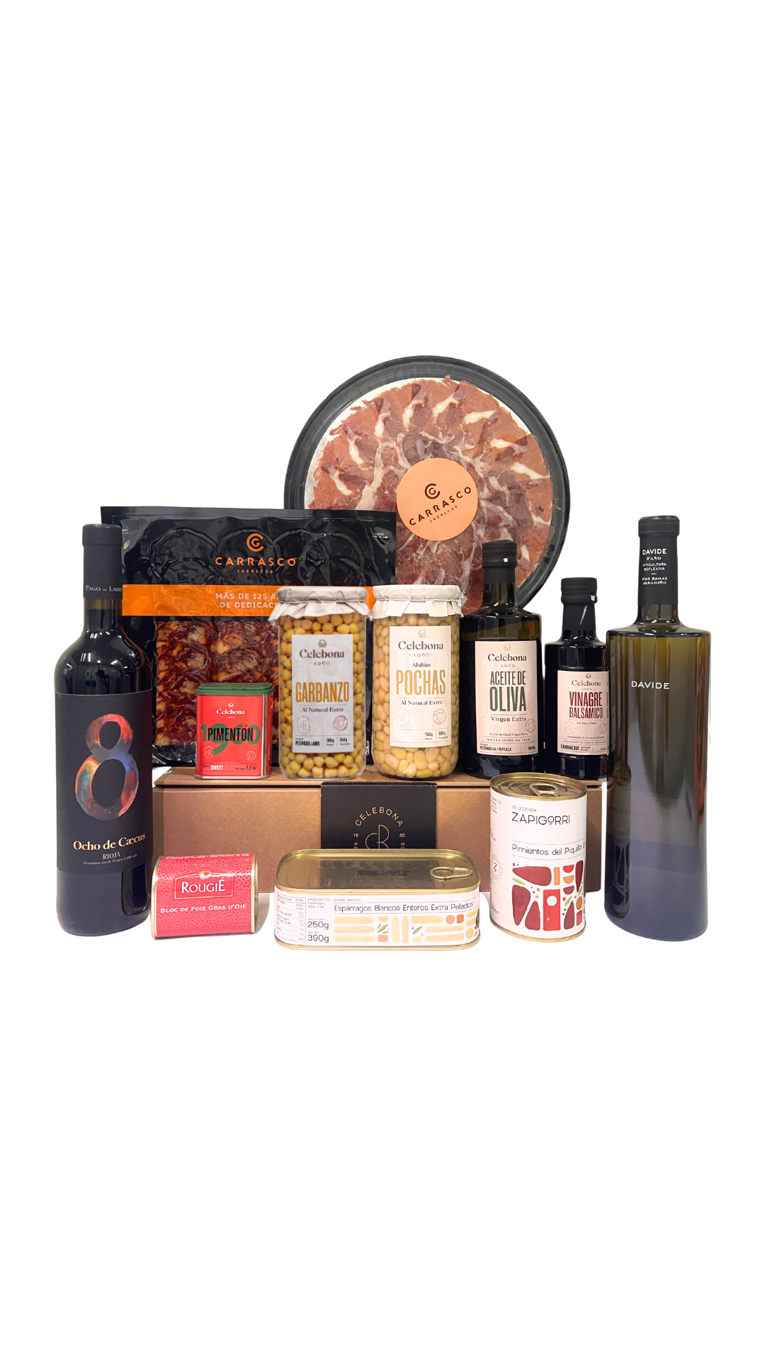 2297 Celebona – Estuche con Botella AOVE Arbequina 250 ml. Vinagre Balsámico 250 ml. Garbanzos, Pochas y Pimentón